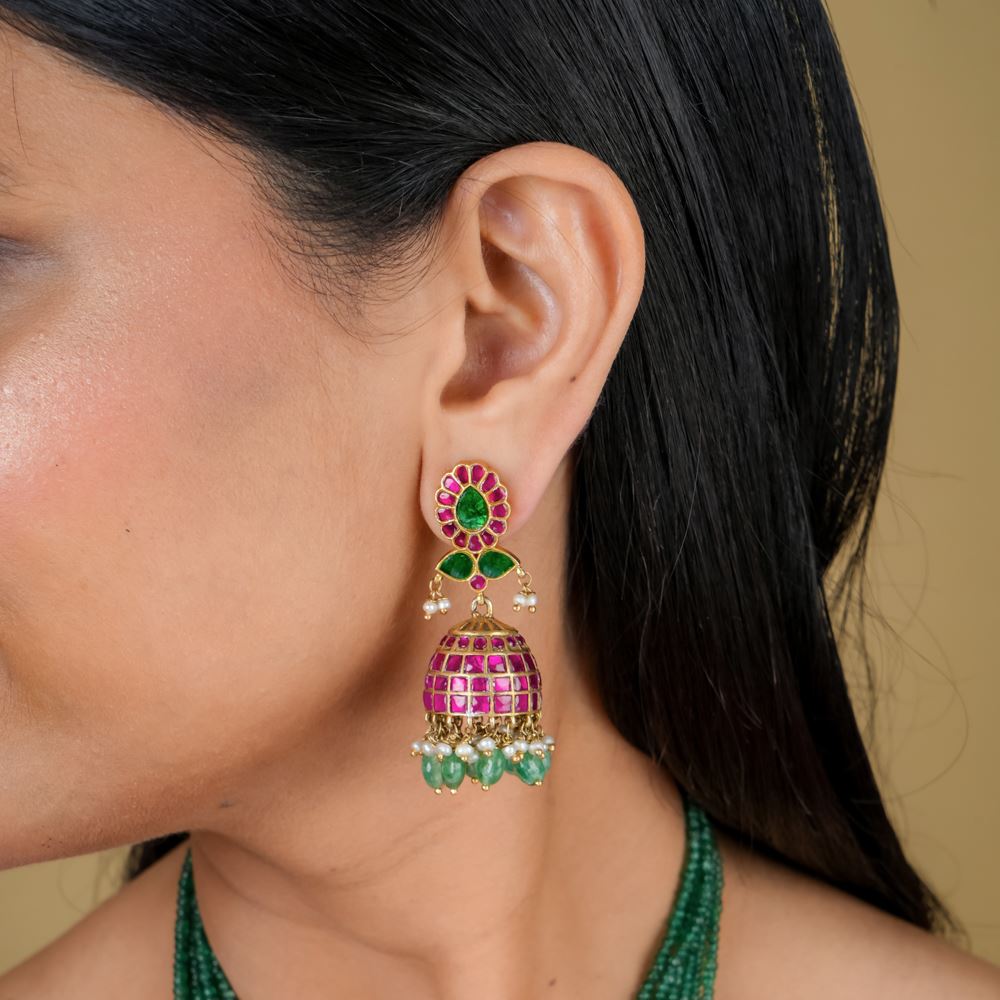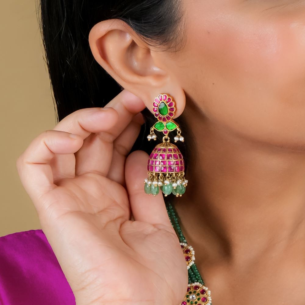 Kundan Jhumki With Green Strawberry Quartz Dressing