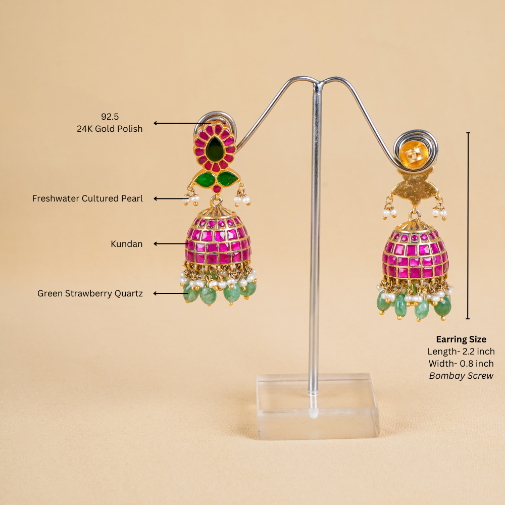 These stunning jhumkis, handcrafted from pure silver, add exquisite elegance without weighing down your ears or your wallet. Featuring green strawberry quartz, freshwater cultured pearls, and Kundan work, these earrings will look remarkable with traditional attire.