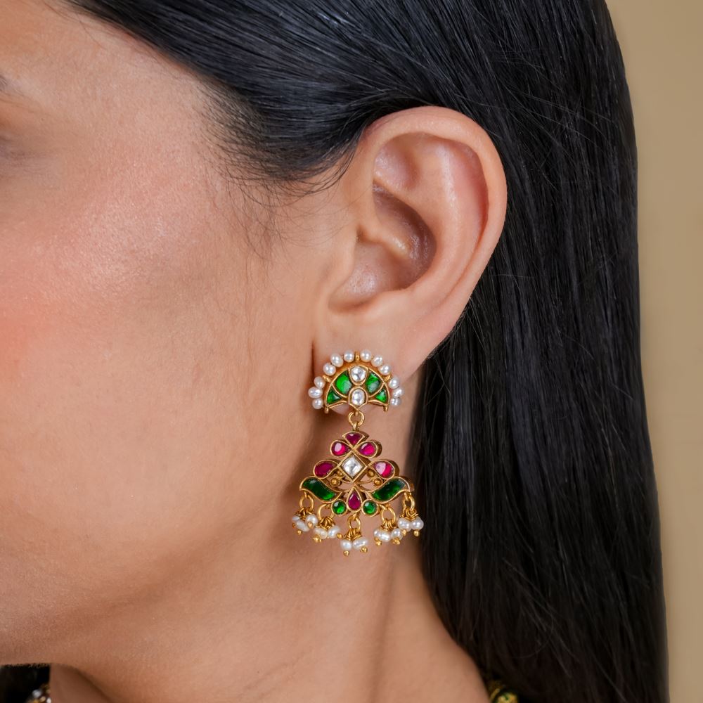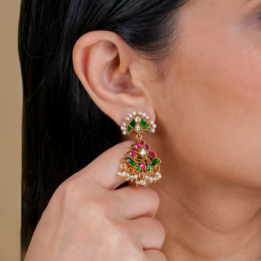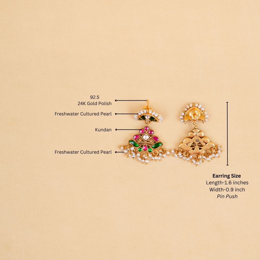 These exquisite Kundan earrings are a perfect blend of traditional craftsmanship and contemporary elegance. Handcrafted with precision, each earring showcases the intricate beauty of Kundan work, complemented by lustrous freshwater cultured pearls. The pearls add a touch of sophistication, while the Kundan detailing radiates regal charm and timeless appeal.
