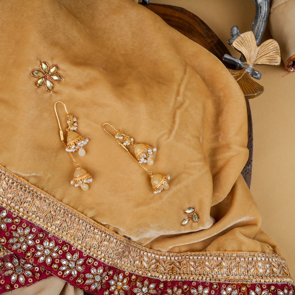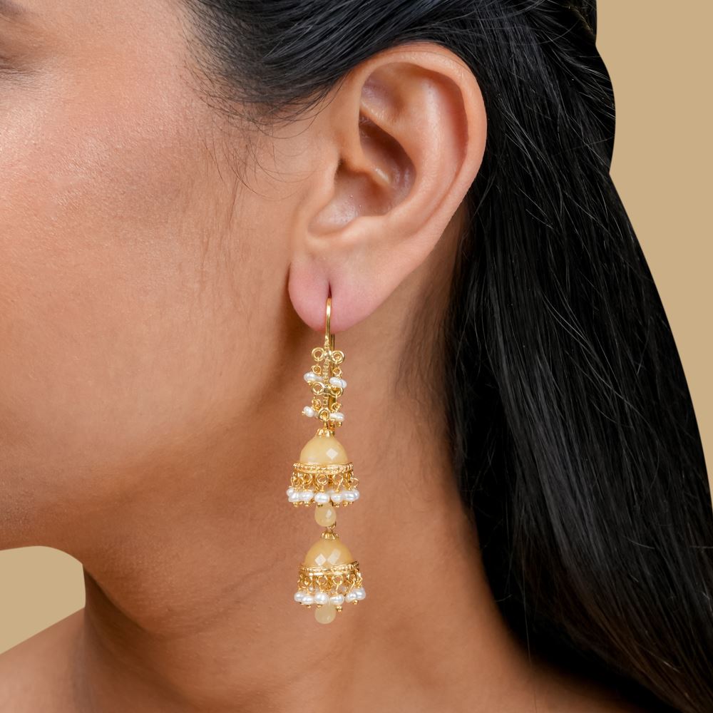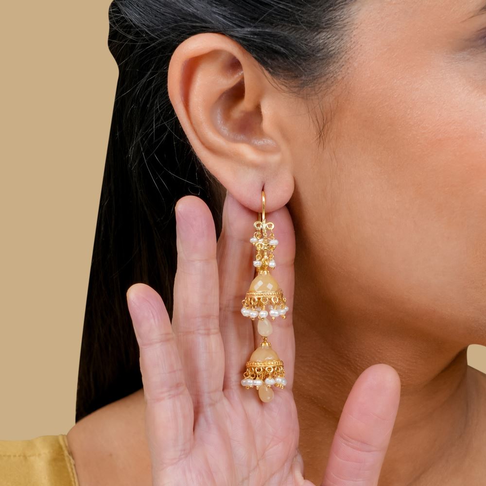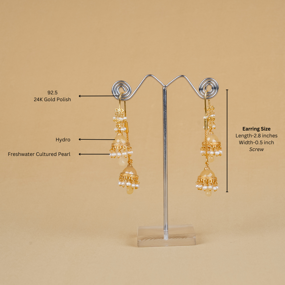 This double jhumki reinterprets traditional designs by blending diverse influences, enhancing your ensemble. Crafted from 92.5 silver, it showcases the elegance of a freshwater cultured pearl beautifully paired with light caramel-coloured hydro.