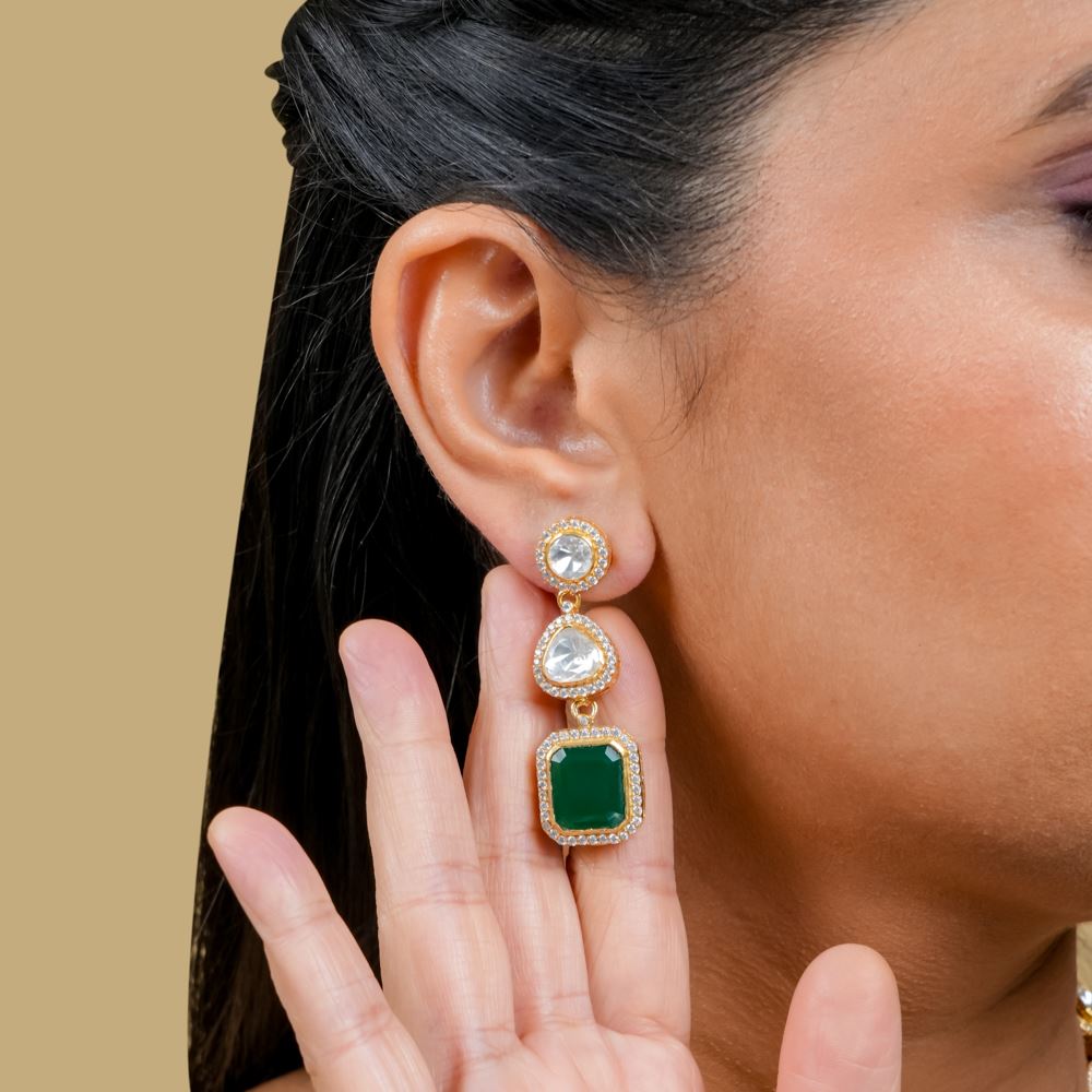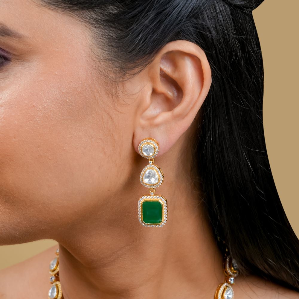 Sunlight or moonlight, these earrings glow wherever you go. The sparkling hydro emerald meets shimmering moissanite polki and Swarovski zirconia, creating a touch of elegance. It's the perfect partner for your unique style.