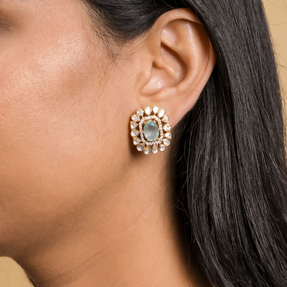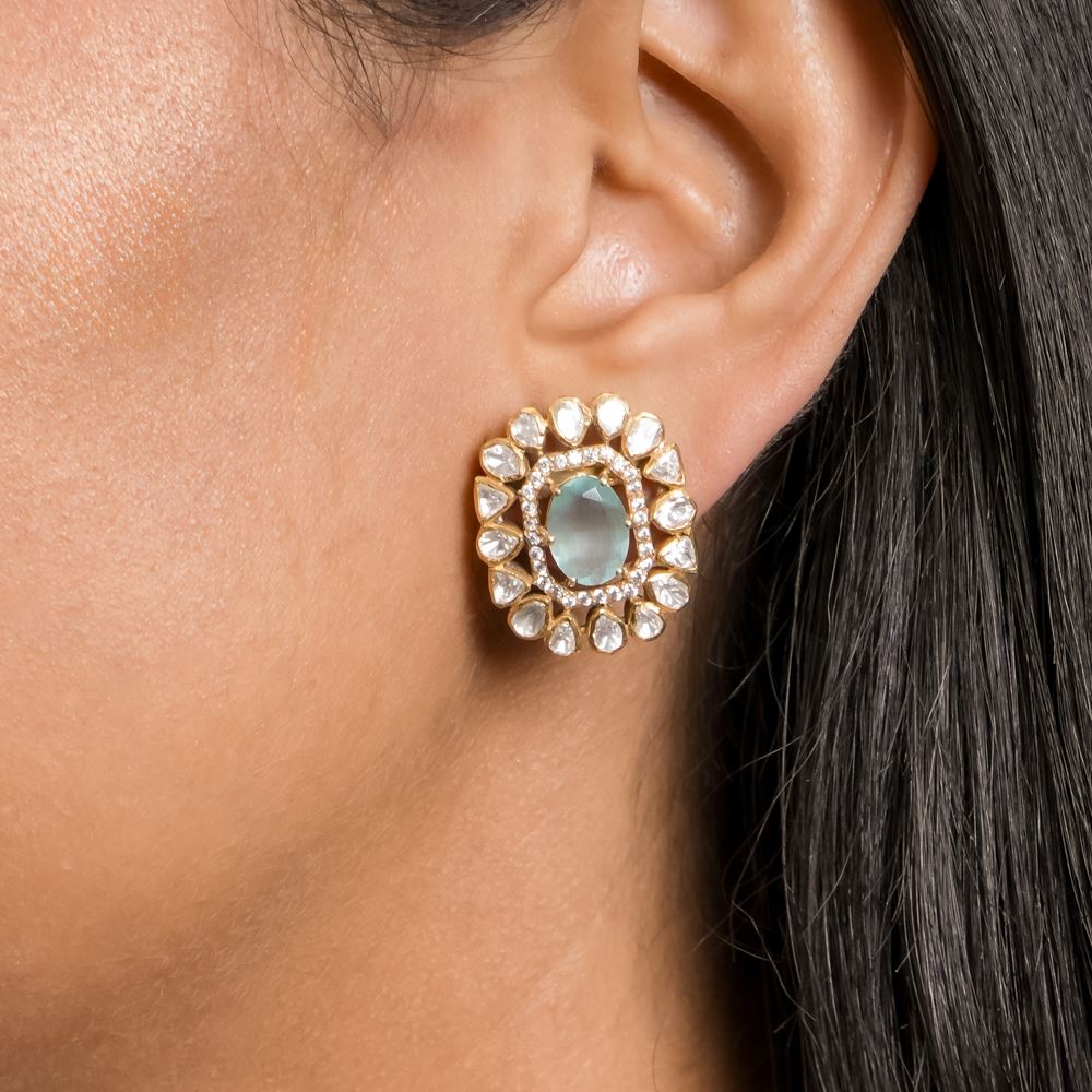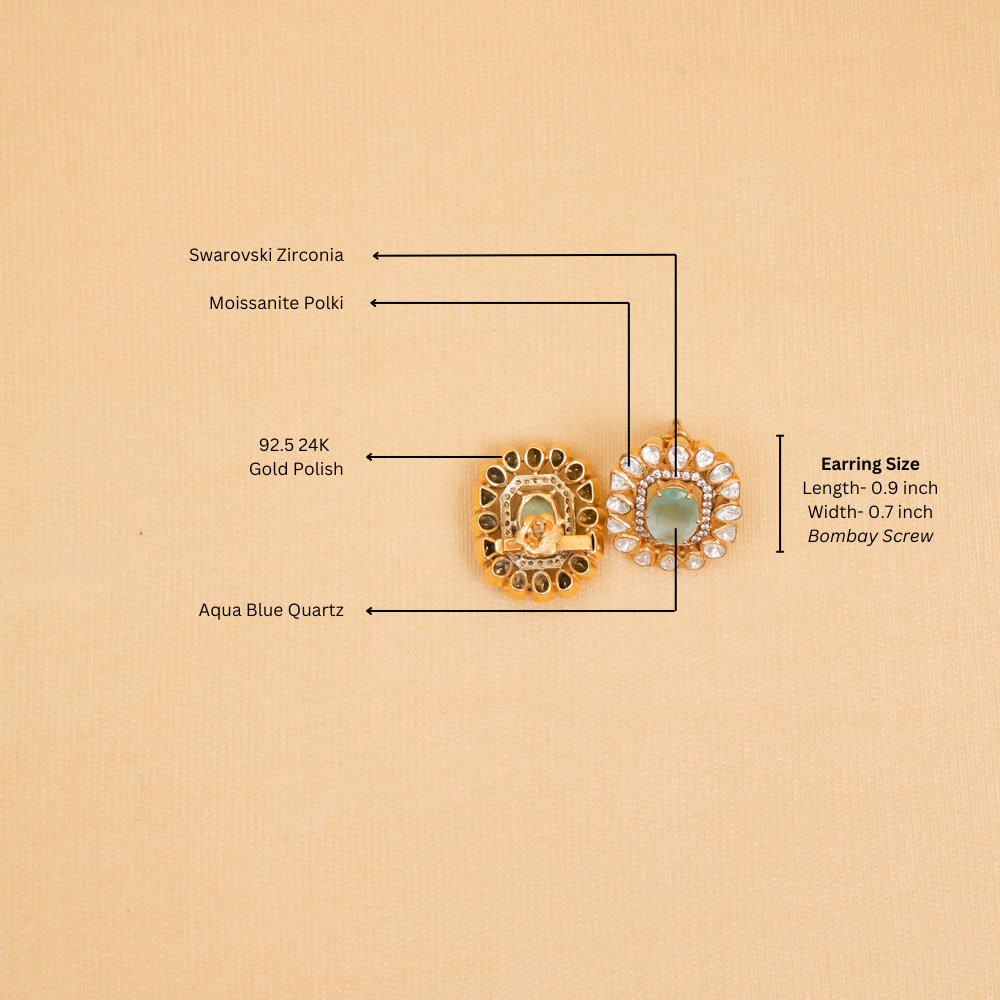 Every speck of these moissanite aqua hydro quartz gleams with beauty. Set in 92.5 silver, these bold studs bring a soothing colour to your colourful attire.