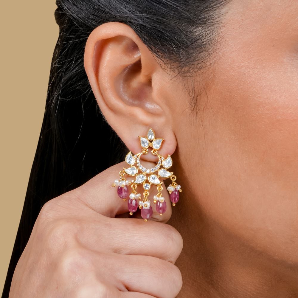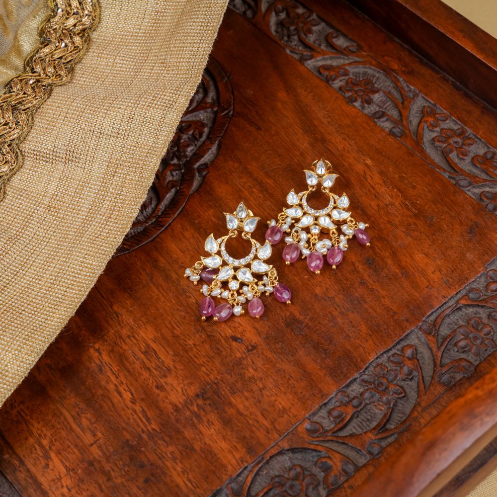 Introducing these exquisite chaandbalis, handcrafted from 92.5 silver and adorned with enchanting moissanite polki work and radiant Swarovski zirconia. The natural tourmaline adds a charming elegance, making them a perfect accessory to elevate any outfit.