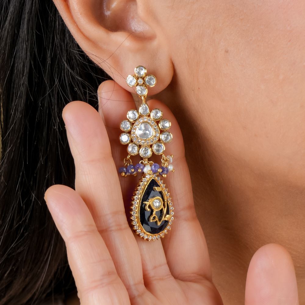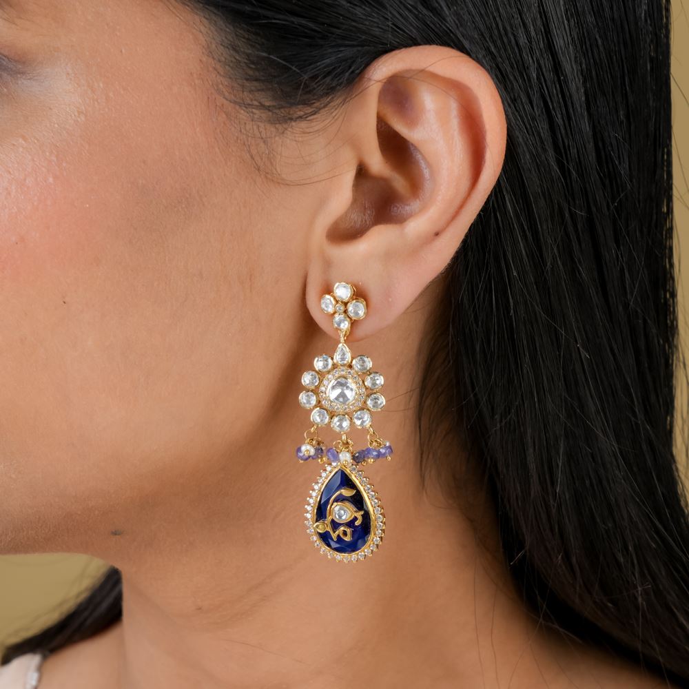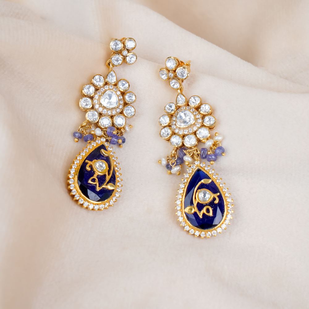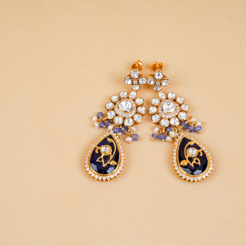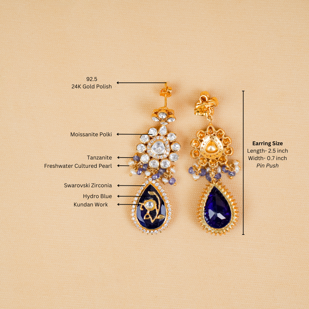 Ready to level up your jewellery collection? We have this earring for you. Set in silver 92.5, the rare tanzanite complements the overall earring that features moissanite Polki, Swarovski zirconia Stone, freshwater cultured pearls, and hydro blue. It's a perfect piece to dazzle up for your party.