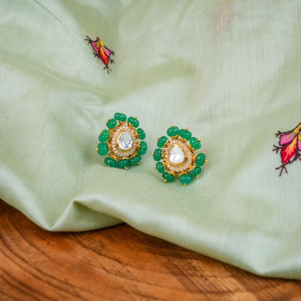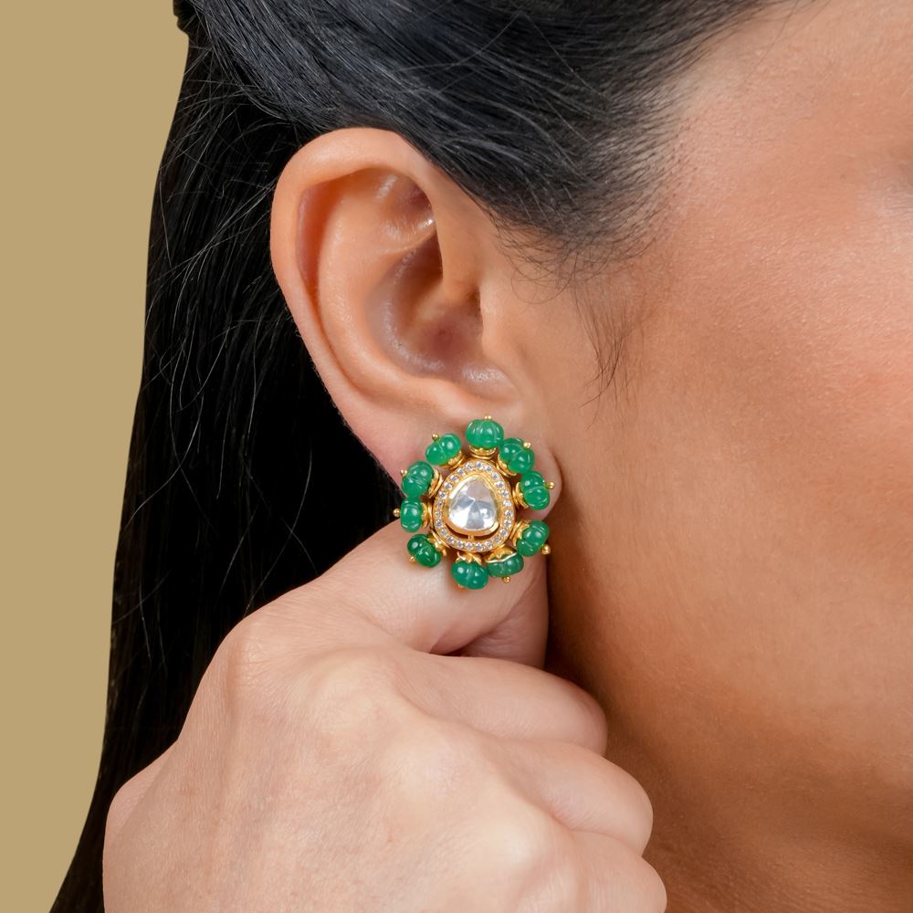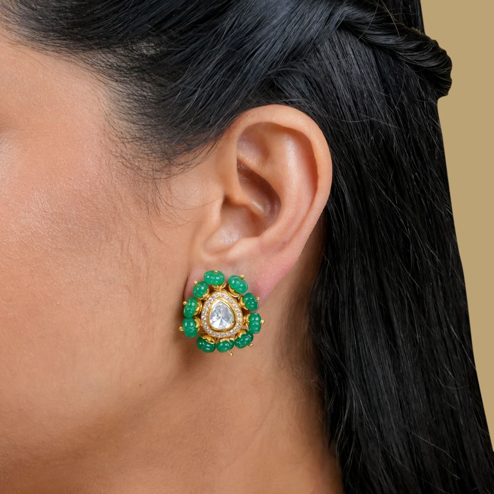 Pumpkin Shaped Green Onyx With Moissanite Polki Studs
