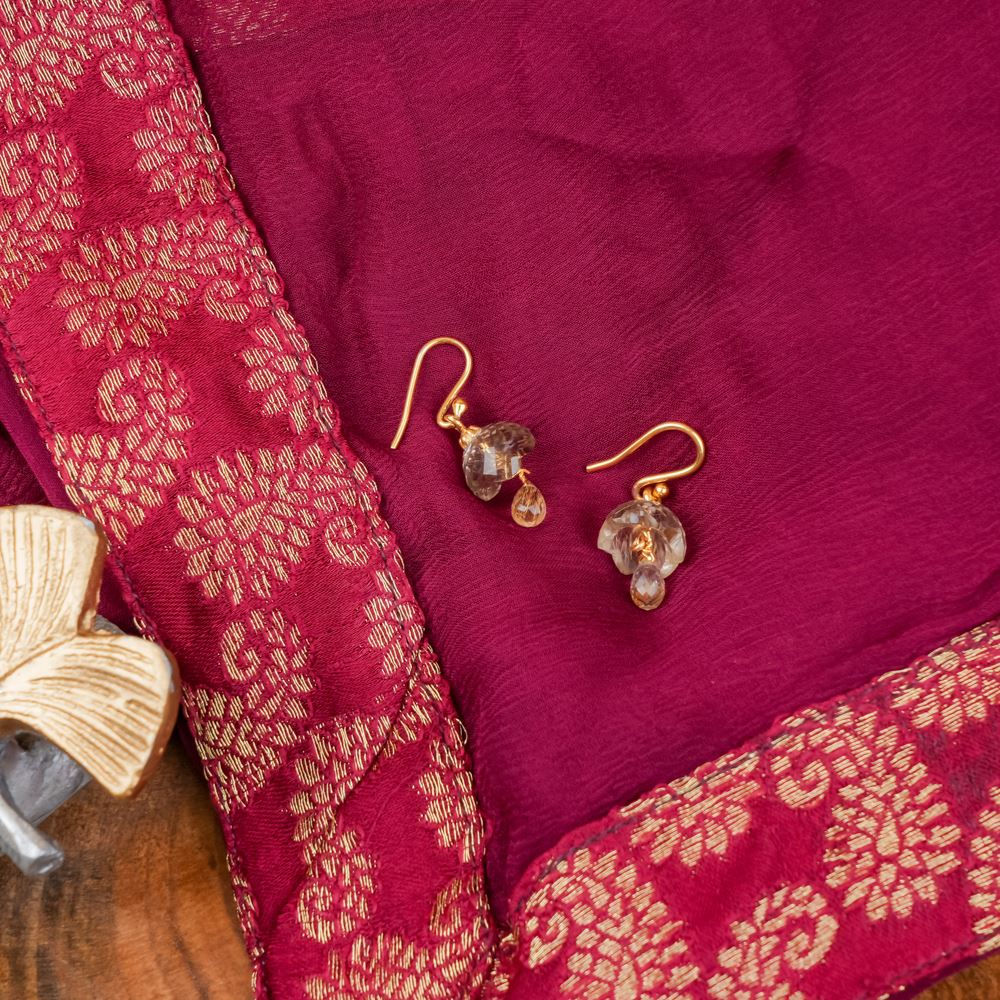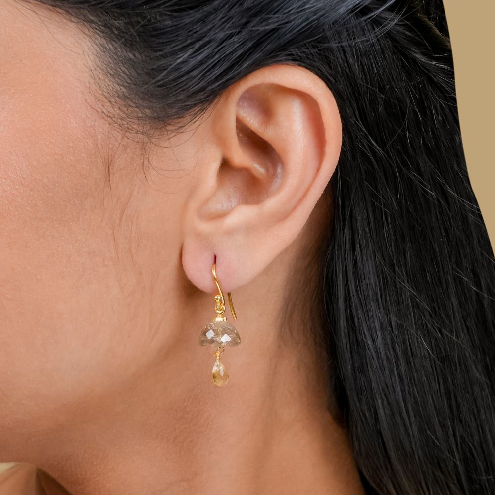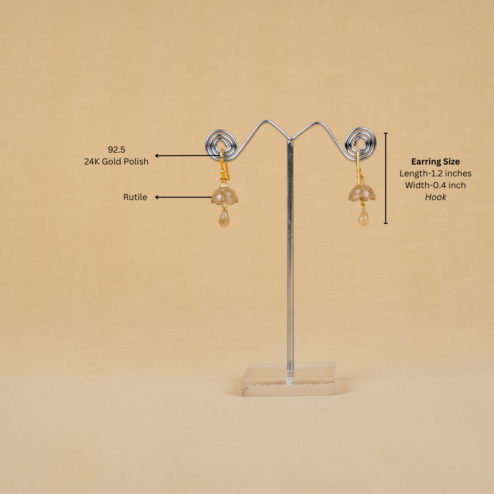 These exquisite dainty jhumkis are crafted from rutile stone, giving them an ethereal look. The hook design makes them easy to wear with any floral casual dress.