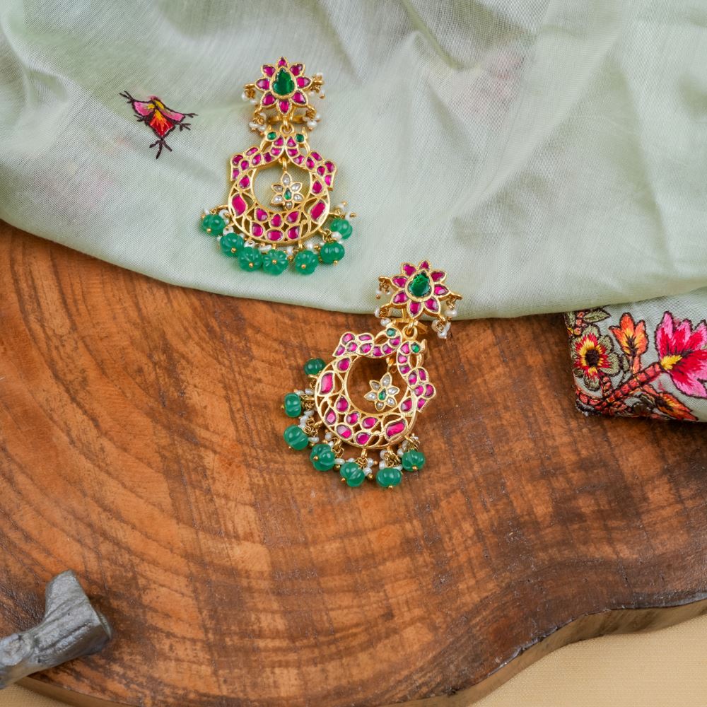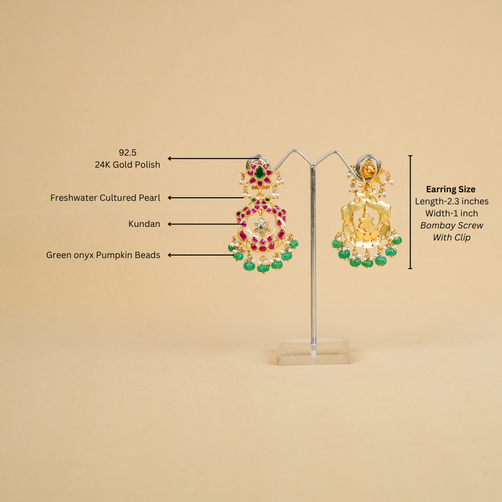 These stunning earrings, handcrafted from pure silver, add dazzling elegance without weighing down your ears or your wallet. Featuring Green onyx along with freshwater cultured pearls and Kundan work, this earring will look stunning for traditional attire.