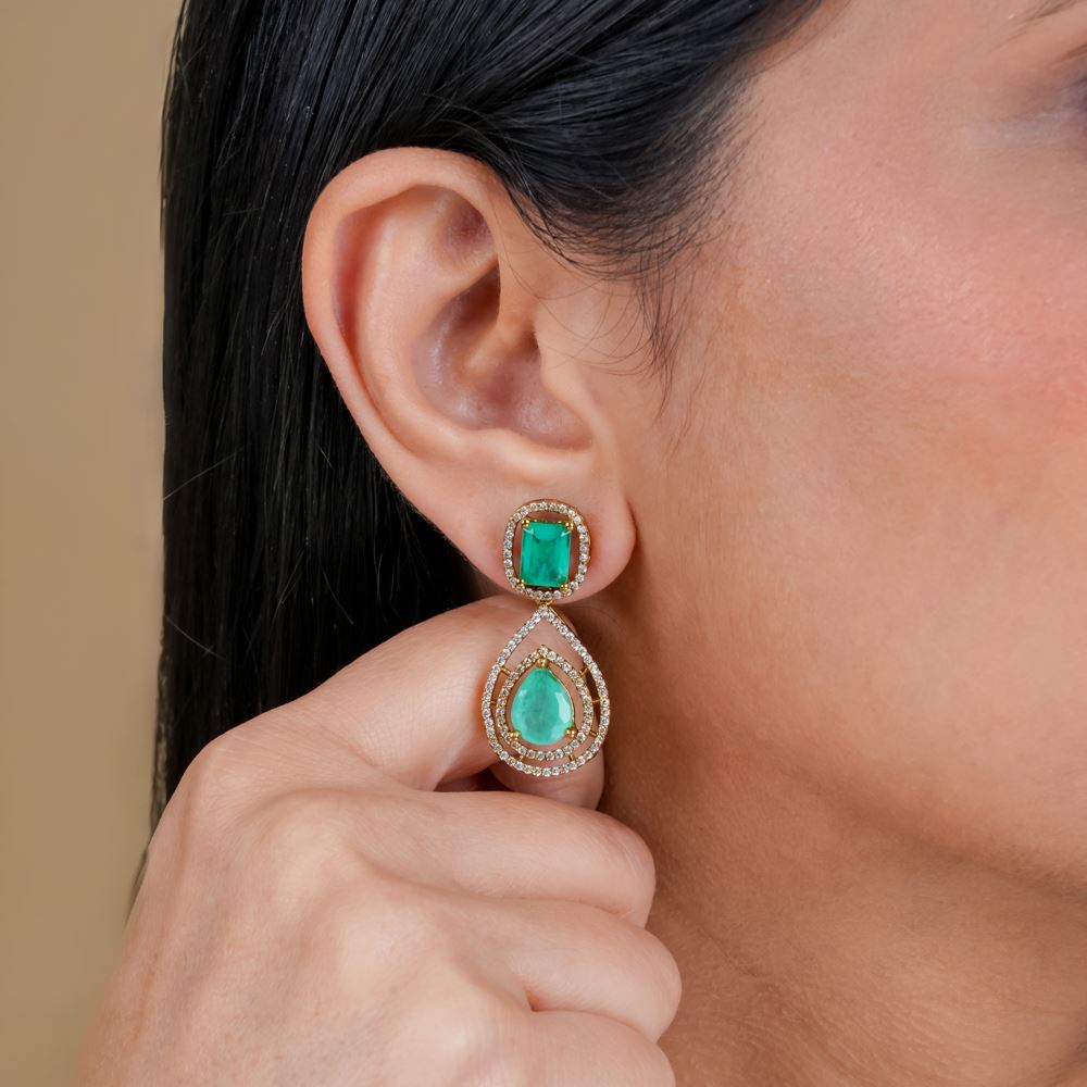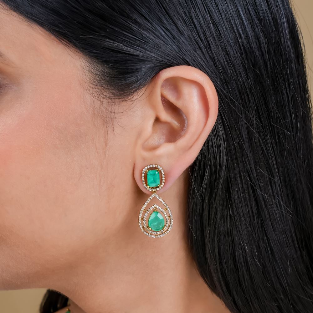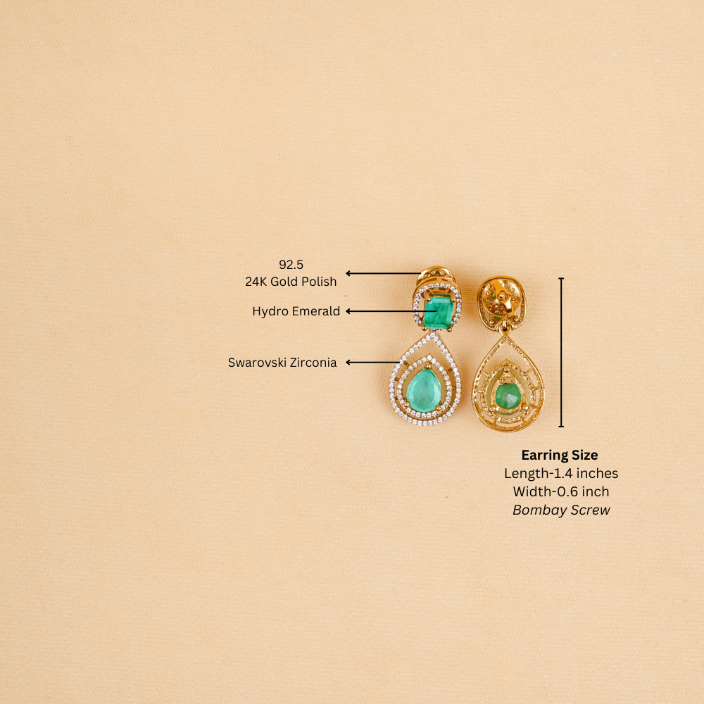 The radiant hue of this earring reminds us of Tiffany blue quinceanera, ensuring a stylish complement to both your modern and traditional outfits. Crafted from 92.5 silver, this piece showcases hydro emerald surrounded by Swarovski zirconia.
