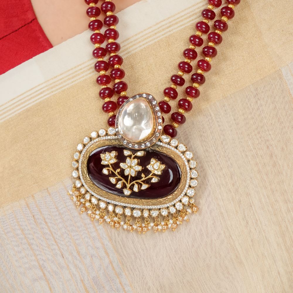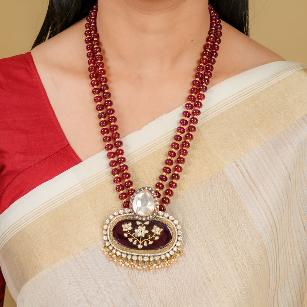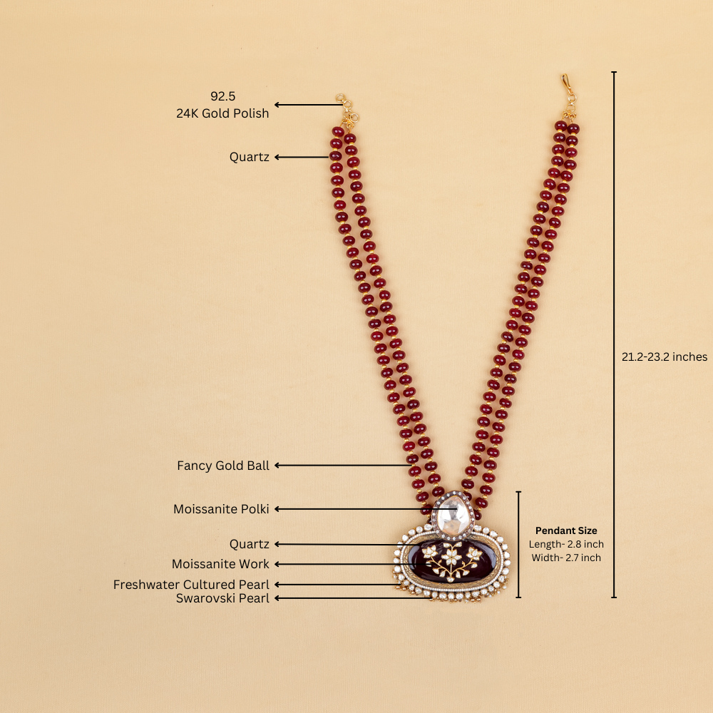 Two layers of radiant quartz cascade into a captivating pendant, a true testament to our daring craftsmanship. We proudly call this design Jodhpur Work, where every delicate detail—especially the intricate floral motif at the center—reflects the artistry of time-honed skills. Embellished with the brilliance of Swarovski zirconia, moissanite polki, and lustrous freshwater cultured pearls, this pendant exudes bold elegance. It’s more than just jewelry; it’s an exquisite statement piece that will make you feel truly sophisticated and radiant.