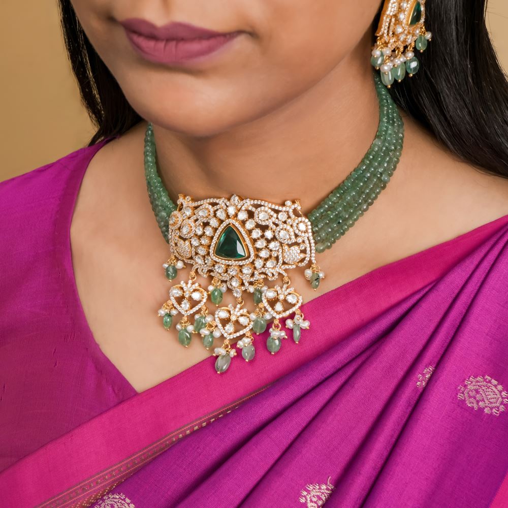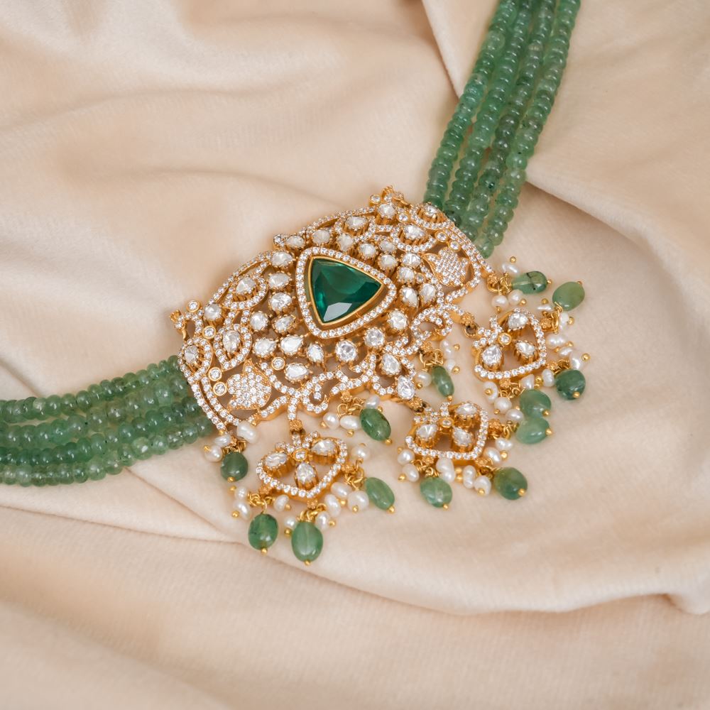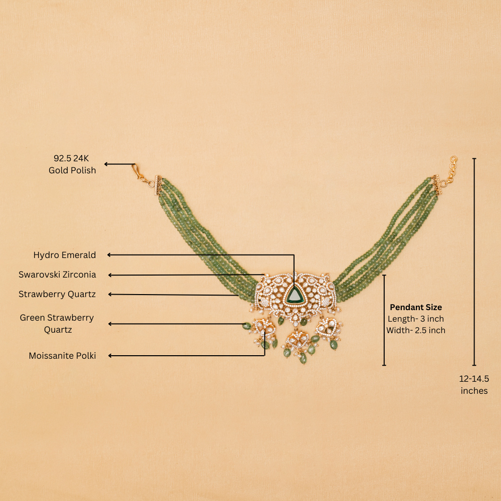 This stunning necklace features four layers of green strawberry quartz, leading to a beautiful pendant featuring a vibrant hydro emerald at its centre. Surrounded by moissanite polki and embellished with delicate freshwater pearls, this necklace is detailly handcrafted in silver 92.5.