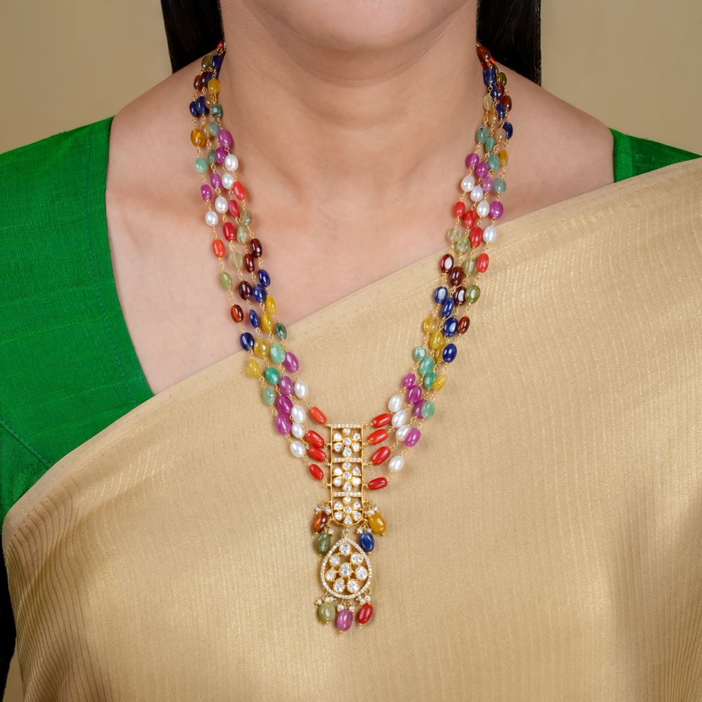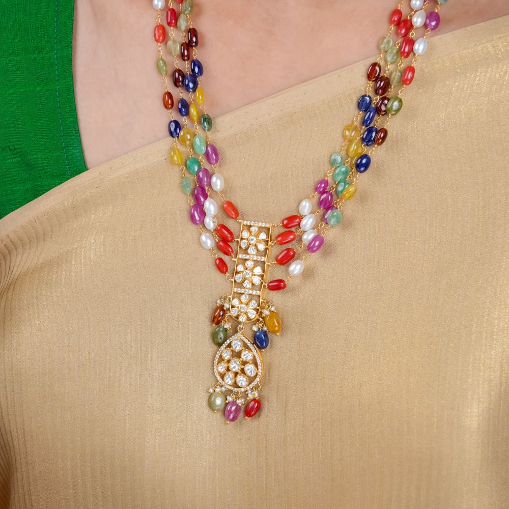 Drape yourself in a bold-coloured saree and adorn your neck with a stunning four-layer natural navaratna necklace. The intricate floral moissanite polki design in the pendant adds a touch of elegance, enhancing the beauty of this necklace. Embrace your day with this lively and colourful piece, and let it reflect your vibrant spirit.