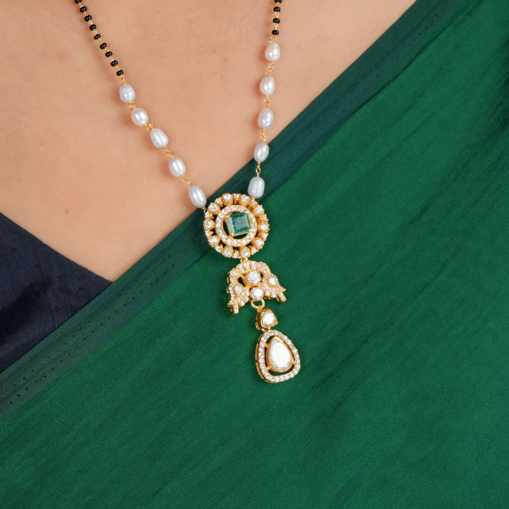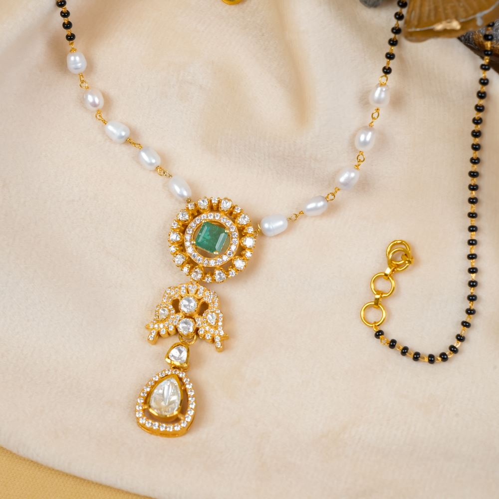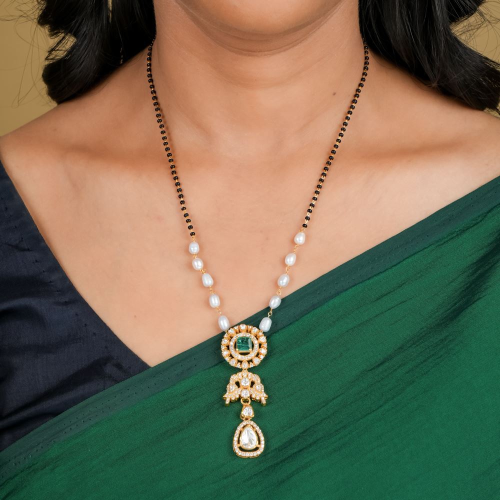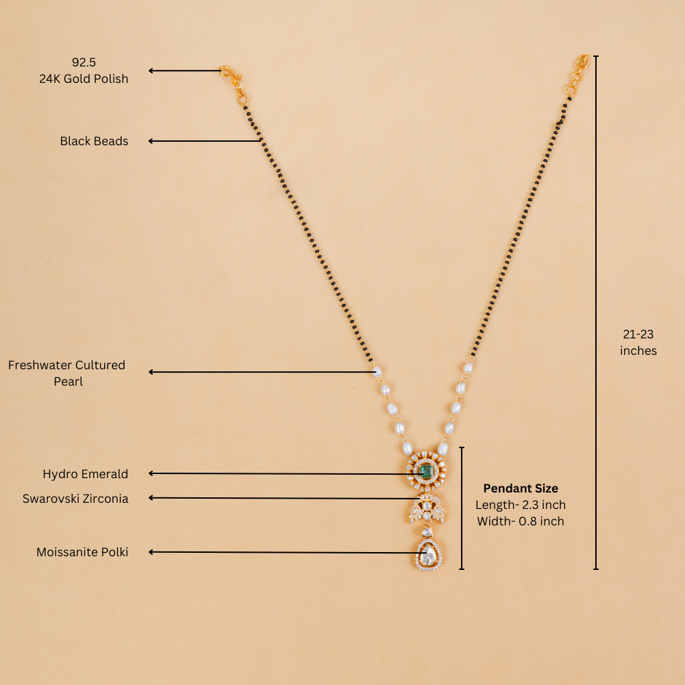 Elevate your style with this modern mangalsutra, featuring a captivating hydro emerald pendant that takes center stage. Nestled among sleek black beads and shimmering freshwater cultured pearls, this meticulously designed piece beautifully combines the elegance of nature with a contemporary touch.