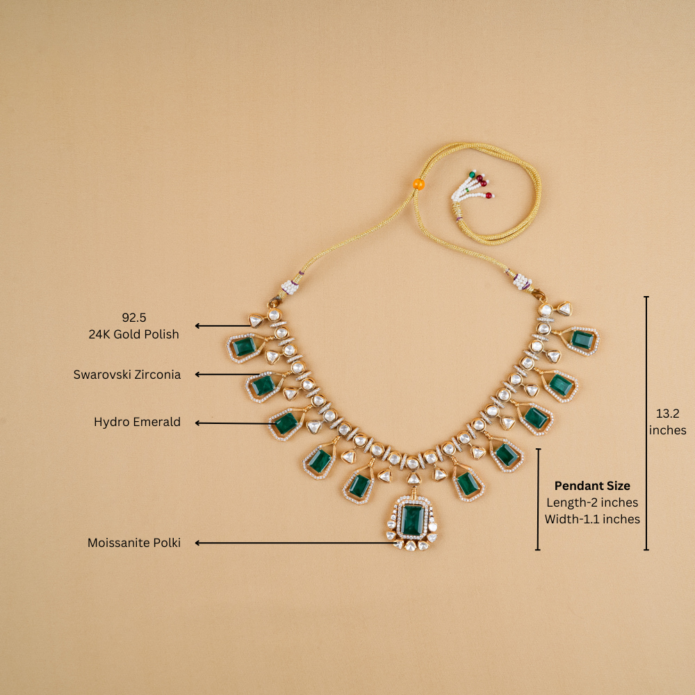 Get ready to receive endless compliments on your special day with this stunning piece. The necklace is meticulously handcrafted in 92.5 silver and embellished with dazzling moissanite polki, featuring a beautiful pendant with a hydro emerald.