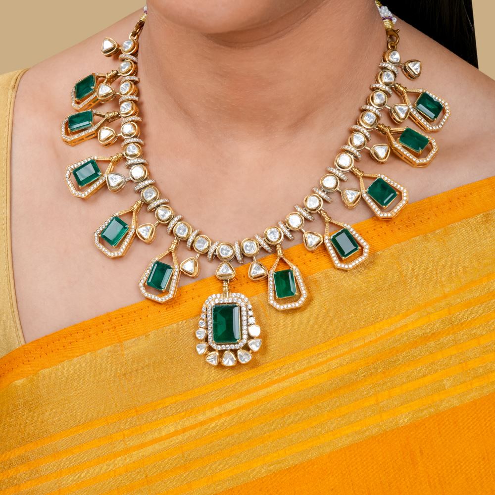 Dazzling Moissanite Polki With Hydro Emerald Necklace