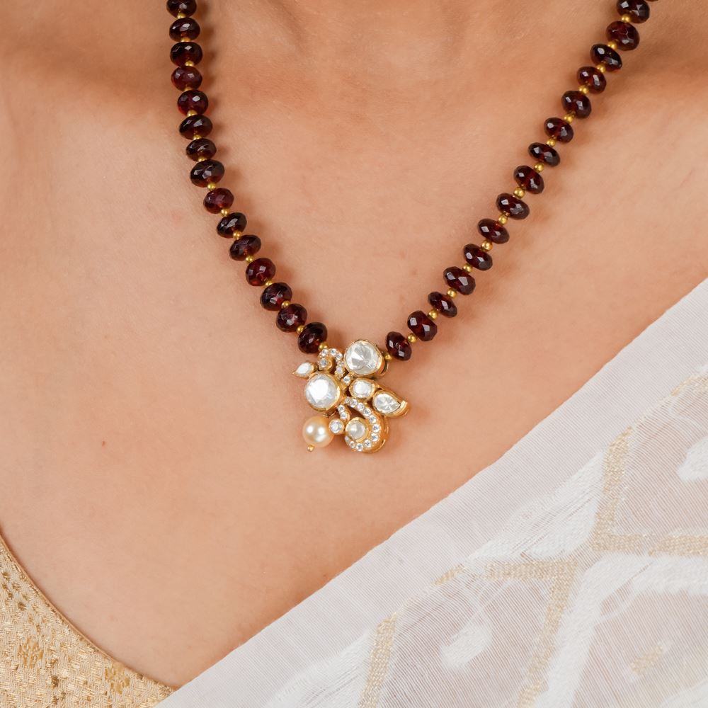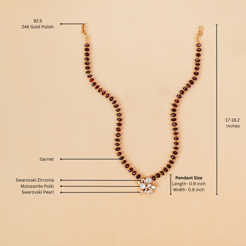 Introducing a timeless piece of elegance. This stunning necklace, crafted in 92.5 silver, is a must-have for any jewellery lover. Delicately designed and comfortable to wear, it showcases the beauty of garnet, moissanite polki, and Swarovski zirconia stones. Add a touch of grace to your collection with this enchanting piece.