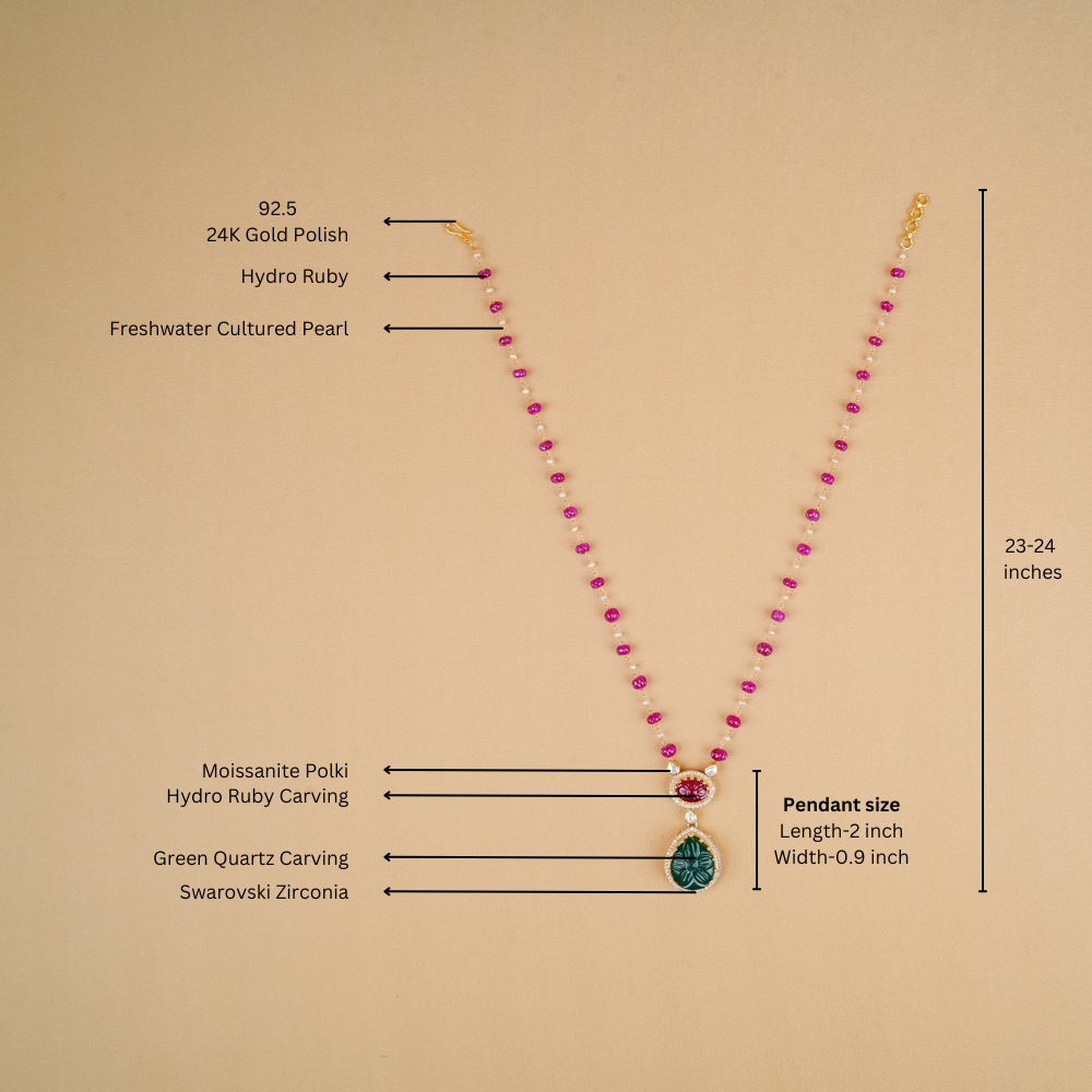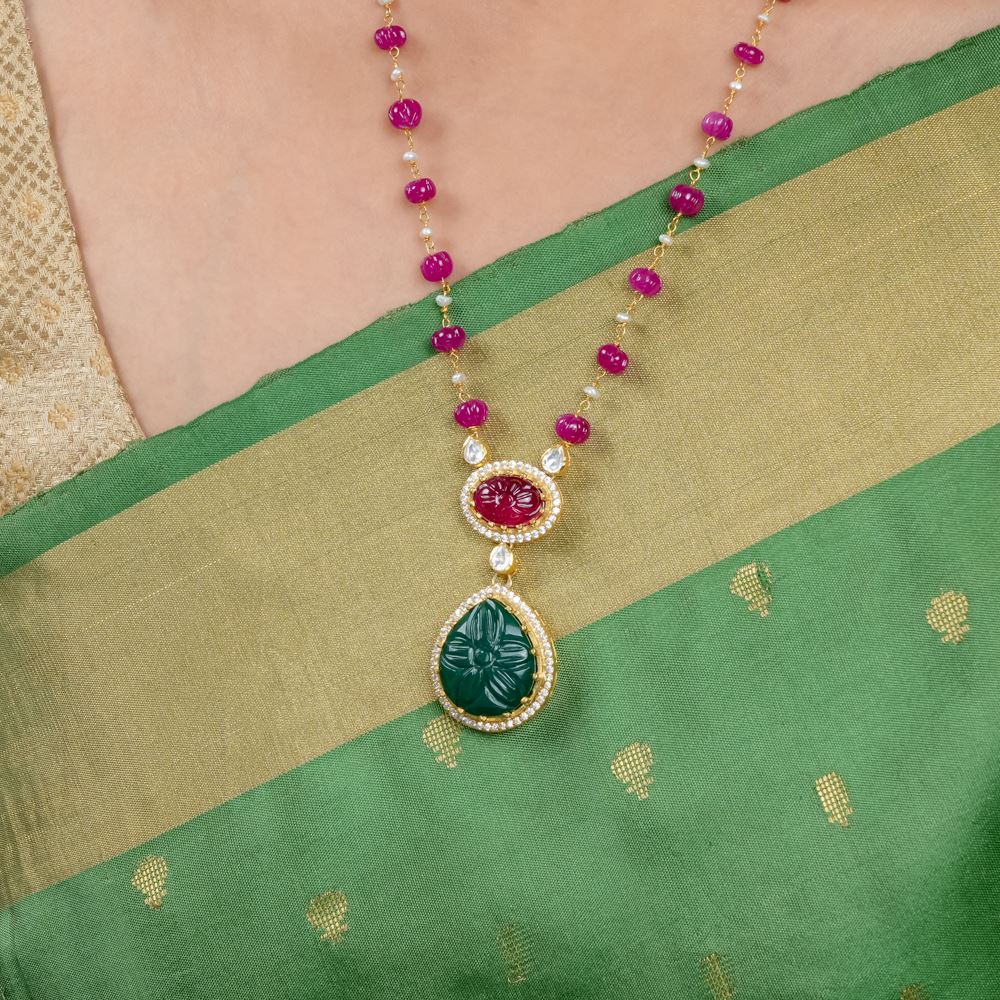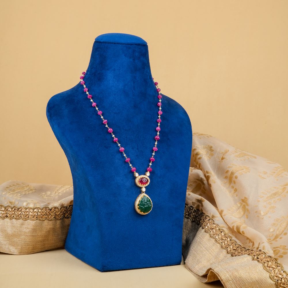 Are you searching for the perfect accessory to enhance your saree or lehenga? This stunning necklace is an ideal choice! It features radiant hydro ruby that cascades beautifully. The centrepiece showcases an enchanting carved pendant adorned with hydro ruby and green onyx, creating a truly mesmerising look.