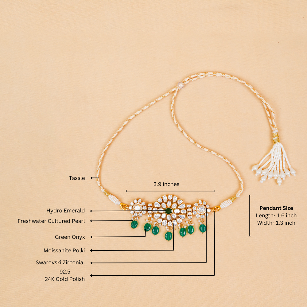 Stones: Green Onyx, Hydro Emerald, Moissanite Polki, Swarovski Pearl, Swarovski Zirconia, Freshwater Cultured Pearl