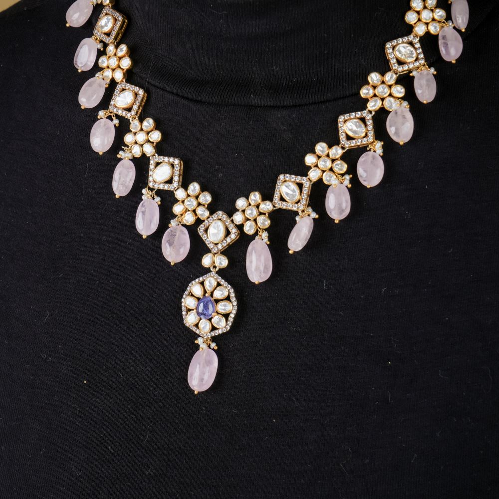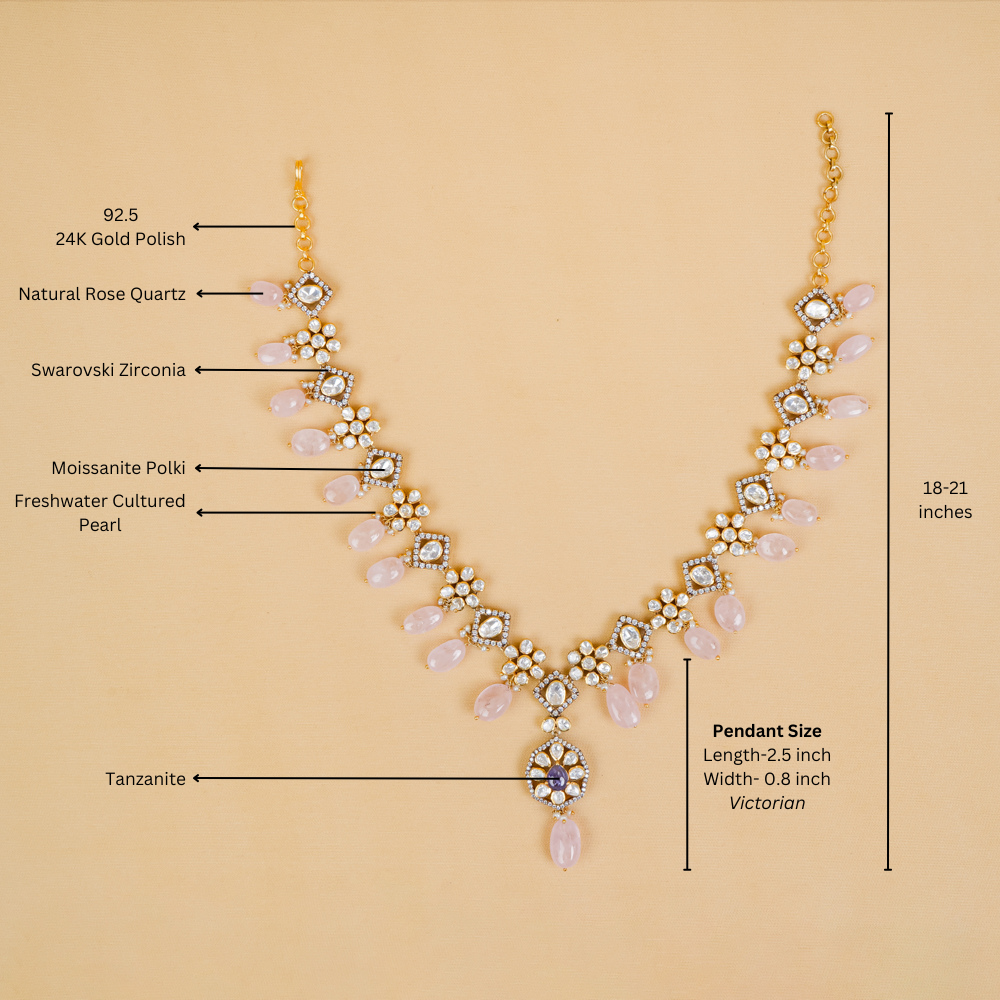 This necklace will captivate everyone with its exquisite craftsmanship and stunning beauty. Handcrafted with moissanite polki, adorned with Swarovski Zirconia stones, and complemented by natural rose quartz, it brings a radiant allure to your neckline. Not to forget the beautiful pendant with a rare Tanzanite centerpiece. It's guaranteed to leave everyone in awe.