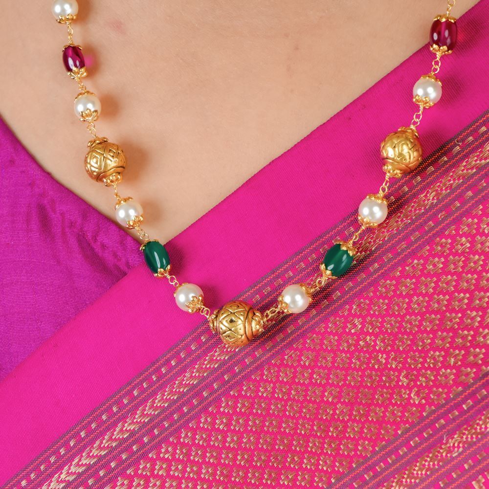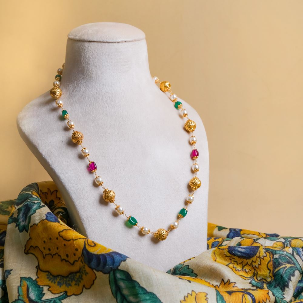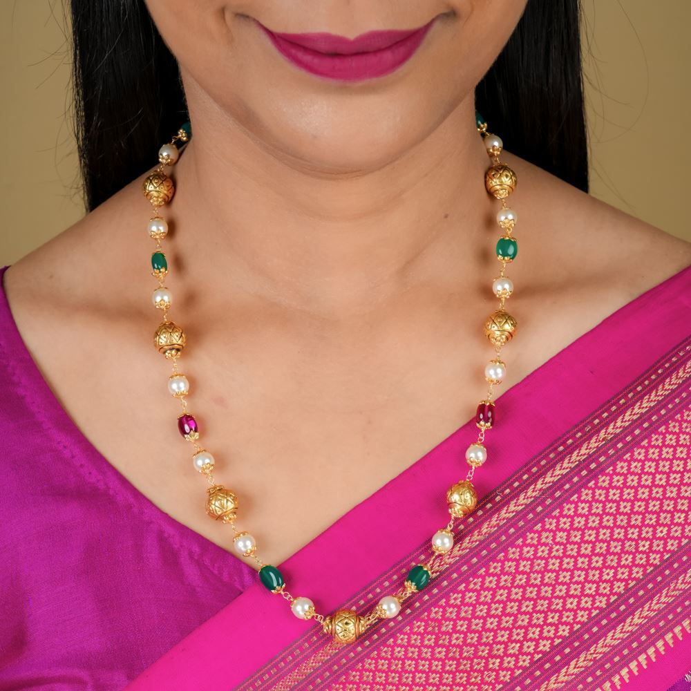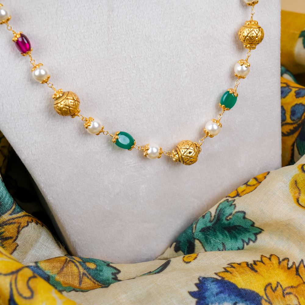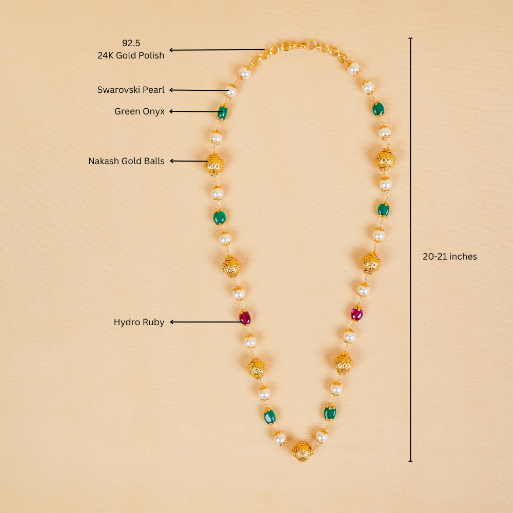 This necklace exudes the timeless elegance of traditional Indian craftsmanship. Perfect for special occasions or to elevate formal attire, it showcases Green Onyx, hydro Ruby, Swarovski pearl, and Nakash Gold balls set in silver 92.5.