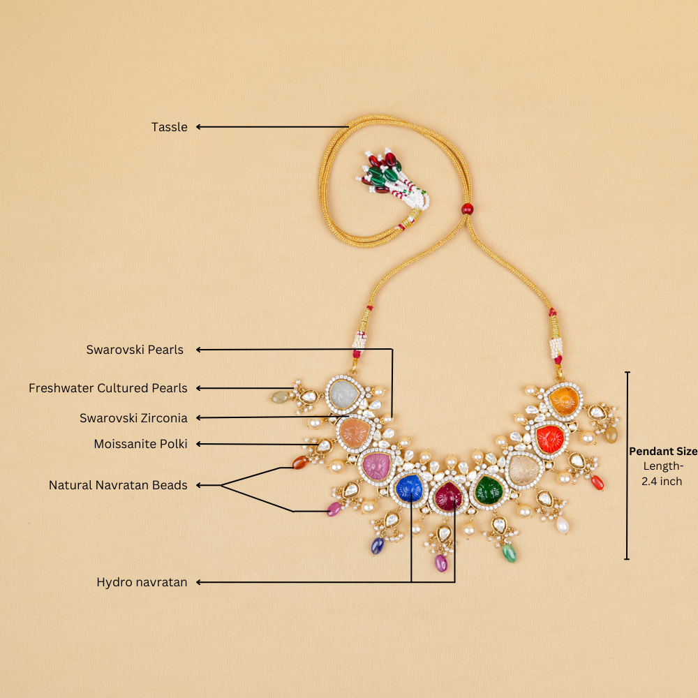Stones: Hydro Navratan Carving, Natural Navaratan Beads, Swarovski Pearls, Moissanite Polki, Freshwater Cultured Pearls, Swarovski Zirconia
