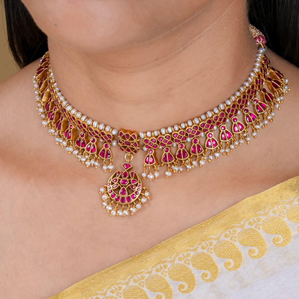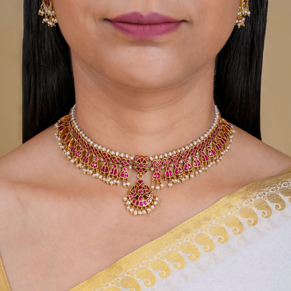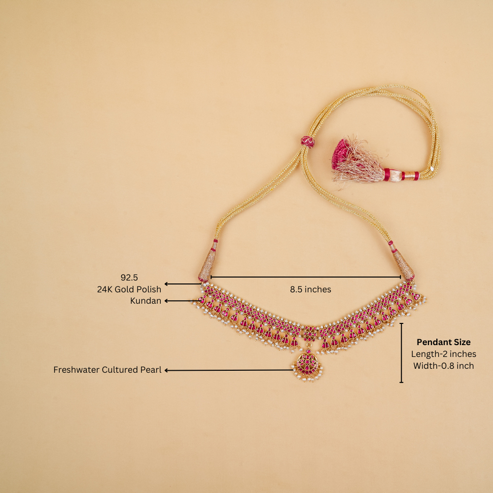 The enchanting pattern of this choker is something the eyes cannot miss. Set in silver 92.5, this piece weaves intricate Kundan artistry with timeless elegance, making it a captivating addition to any jewellery collection.