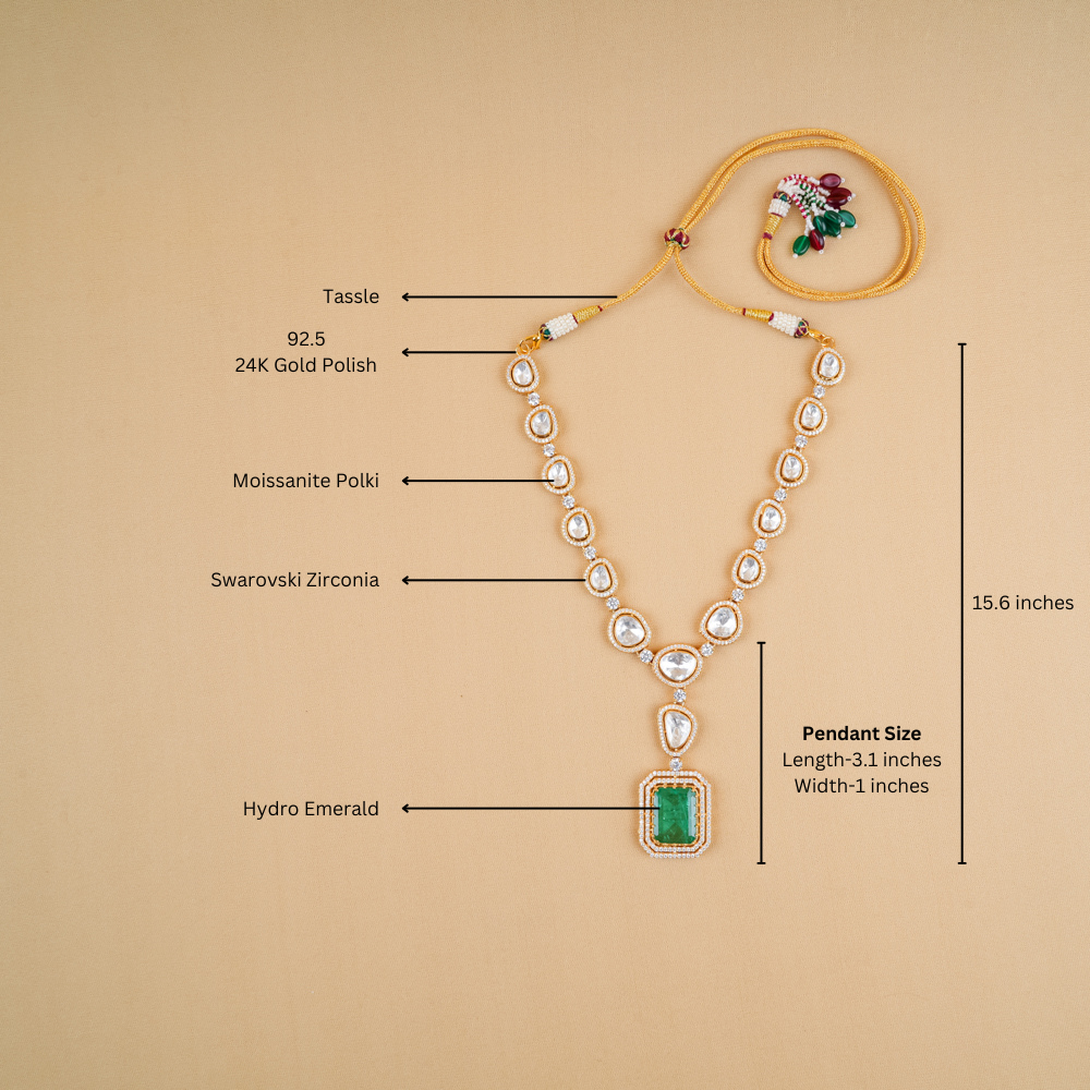 Capture timeless elegance with this stunning necklace featuring a captivating green colour of hydro emerald pendant and moissanite polki. Crafted in luxurious 92.5 silver, this piece epitomises sophistication and style.