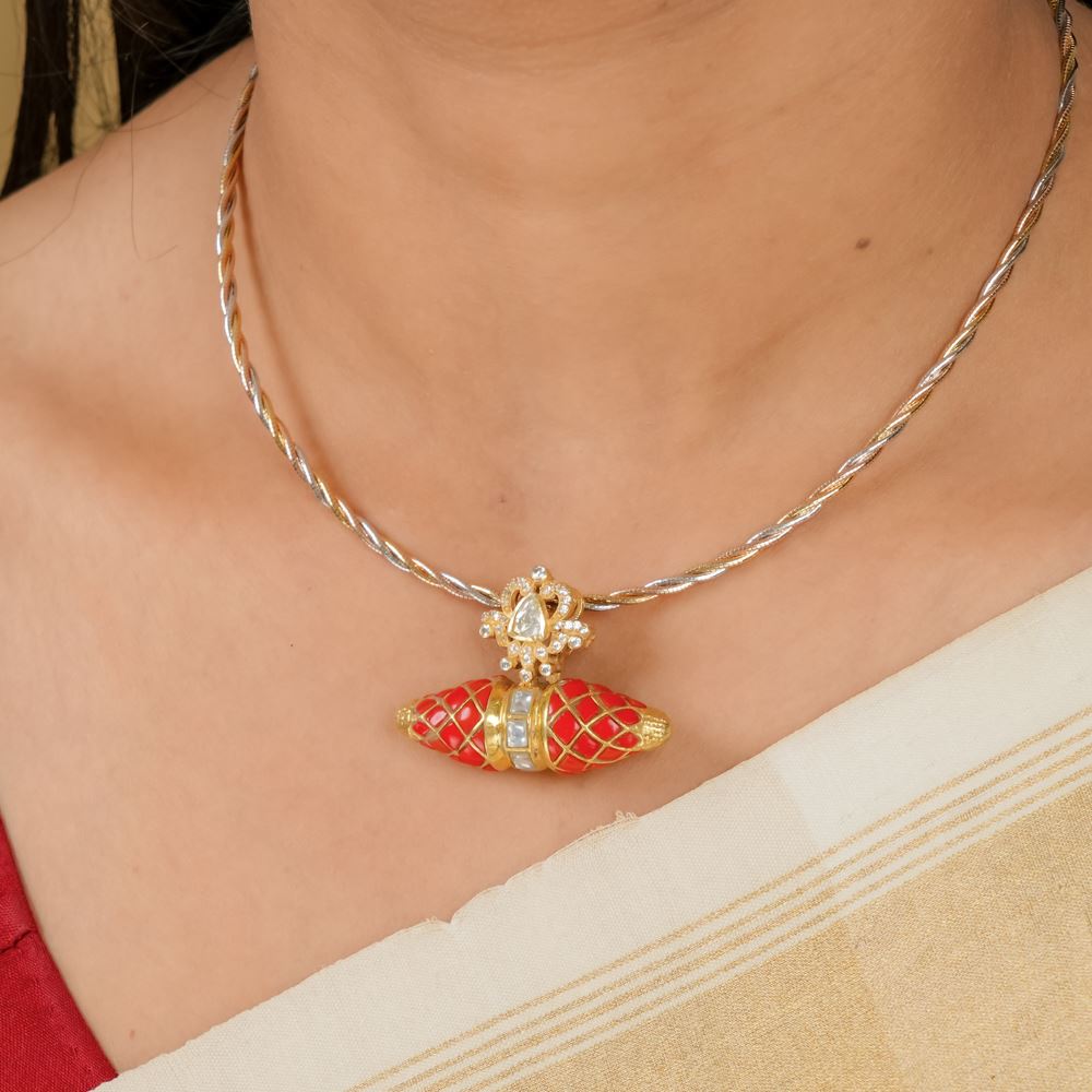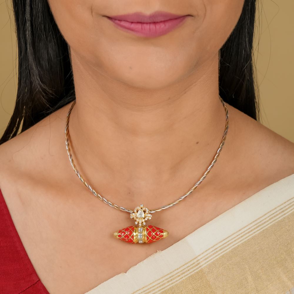 Minimalist yet classy, this pendant can be worn from evening gowns to casual attire. Handcrafted in silver 92.5, it is artfully depicted with Kundan and moissanite polki work.