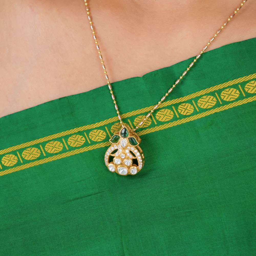 The pendant's beauty lies in its elegant simplicity. Crafted from silver 92.5, this captivating piece showcases moissanite polki, sparkling Swarovski zirconia, and stunning hydro stones. The subtle glam will go in any bold-coloured sarees or dresses.