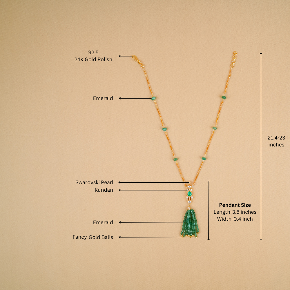 This exquisite natural emerald tassel necklace is a statement piece, perfect for elevating your everyday style. Its vibrant green hues add a touch of elegance, making it a versatile accessory for any occasion. Pair it with a white chikankari kurti for a striking contrast that enhances your charm and sophistication. This necklace ensures you shine effortlessly for casual outings or special moments.