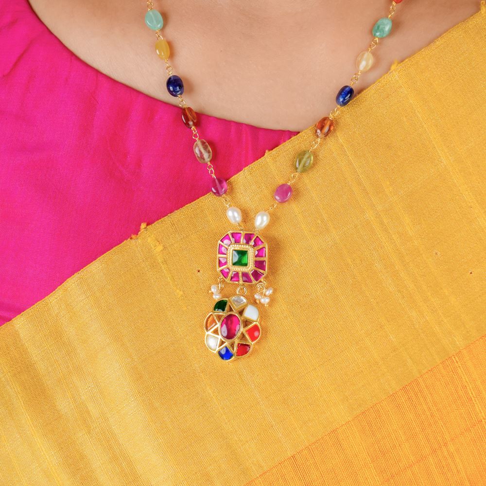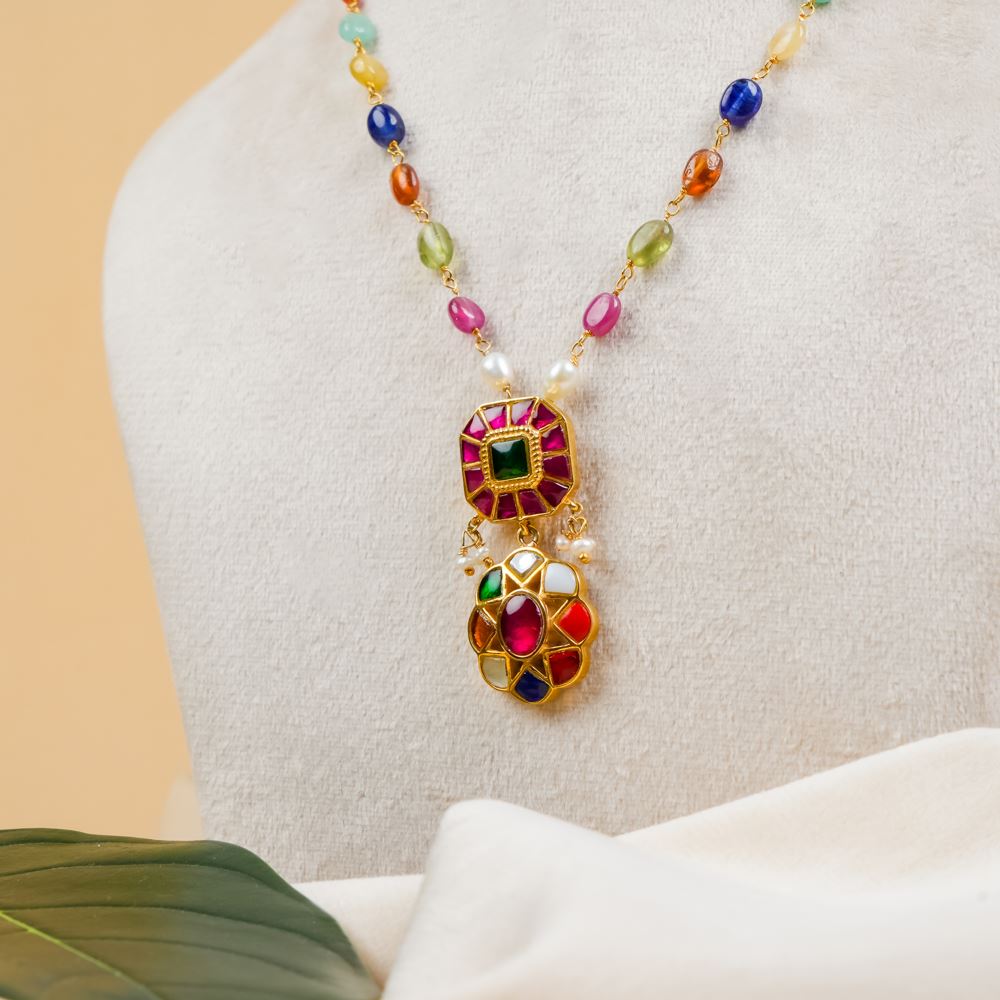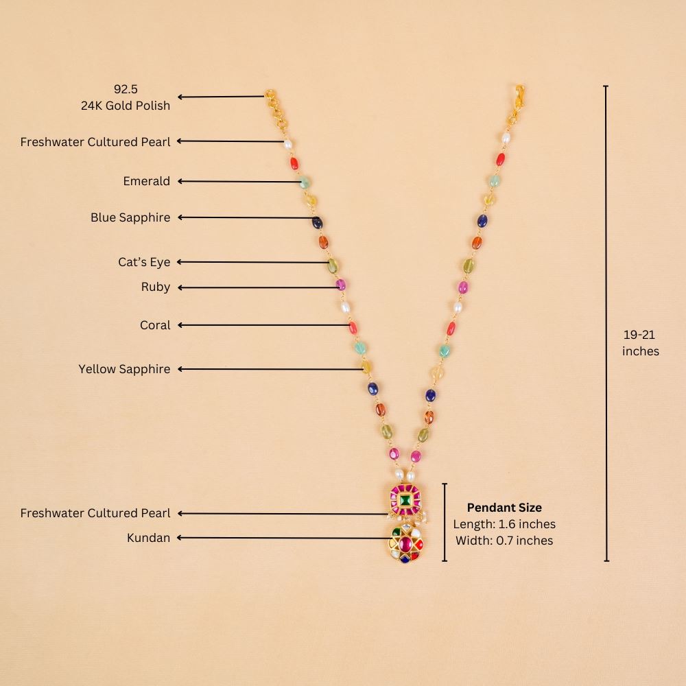 Brighten up your style with our exquisite Navratan necklace, crafted with natural freshwater cultured pearls, ruby, Taiwanese coral, garnet, blue sapphire, cat's eye, yellow sapphire, and emerald. Designed to be both trendy and lightweight, this piece effortlessly combines elegance with everyday wearability.